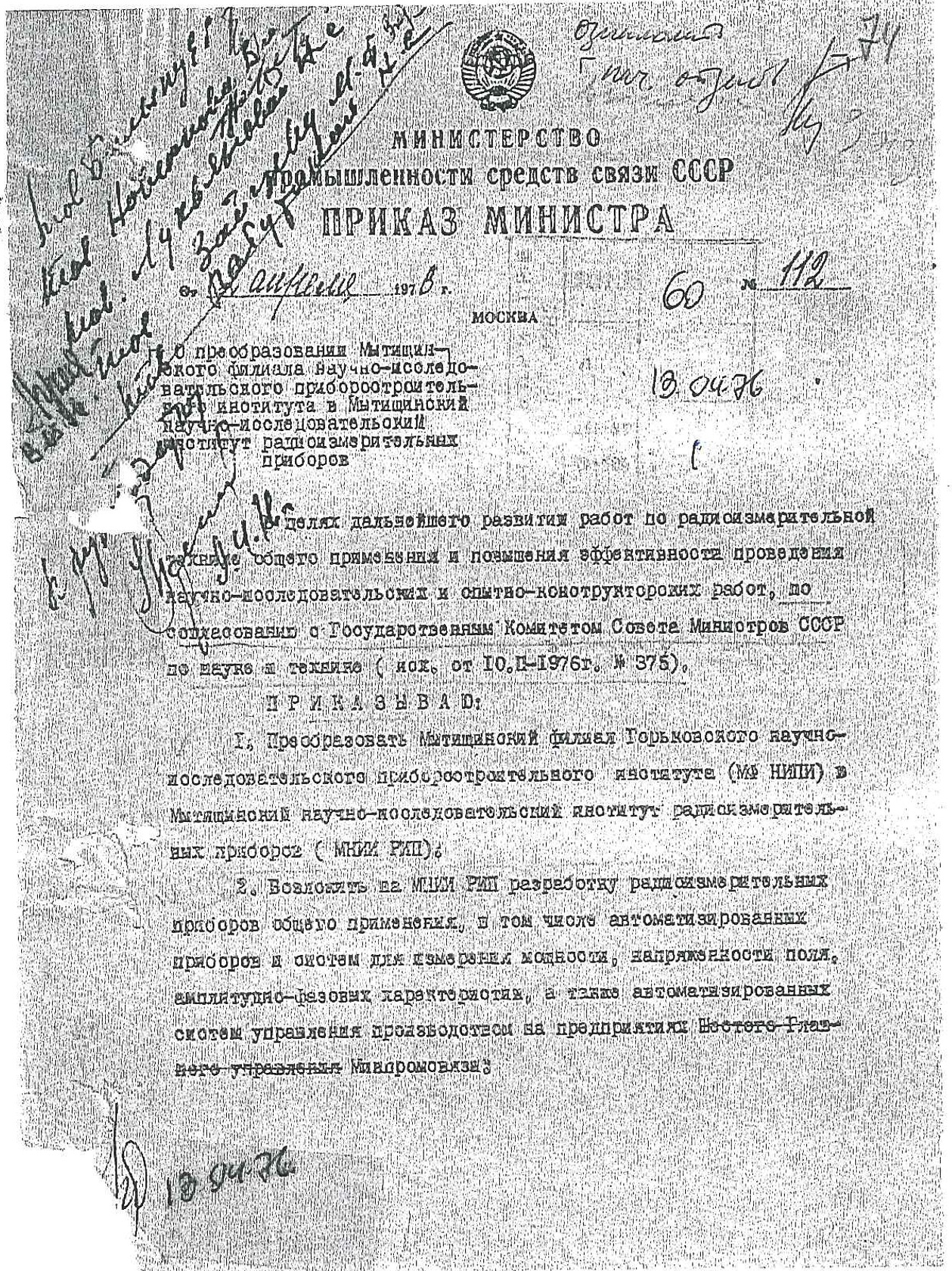 Приказом Министерства промышленности средств связи СССР от 02.04.1976 № 112 Мытищинский филиал ГНИПИ преобразован в Мытищинский научно-исследовательский институт радиоизмерительных приборов (МНИИРИП).